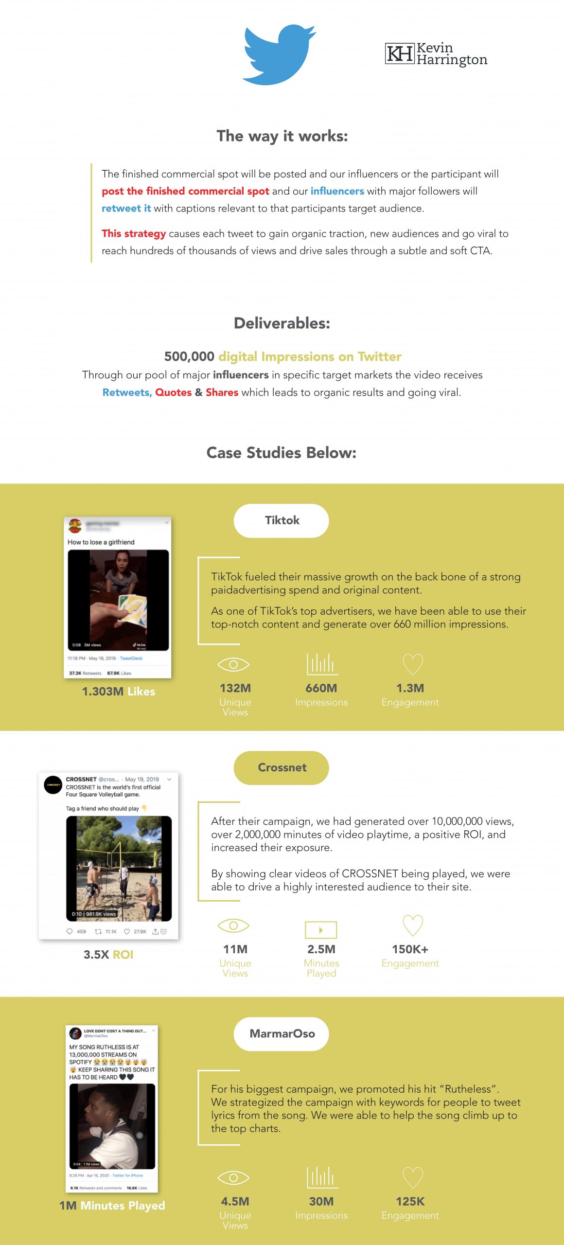 Aside from the television exposure, we integrate a comprehensive marketing campaign utilizing press releases/press wires, social media platforms, relevant blogs and promotions on our AsSeenOnTV.Pro website. For example, our press releases can generate 500+ impressions combined with 1,000+ Social Media Impressions and 1,000+ YouTube Impressions. Kevin Harrington currently has thousands of followers on Facebook, as well as on other social media sites. Kevin’s “reach” figures have averaged over 20,000 organic impressions (without boosts or promos) and peaks above 100,000 with a combination of boosted and organic posts. While we anticipate continued growth of the numbers, it is difficult to accurately measure the entirety of all projected impressions that can be obtained, especially if you continue to repurpose and rebroadcast the spot for additional exposure. The integrated strategies we have implemented throughout the various social media platforms (Instagram, Facebook, LinkedIn, Twitter, etc…) suggest conservative and consistent growth; furthermore, the participant of our TV campaign is encouraged to collaborate with our social media team in order to maximize the potential of these campaigns.